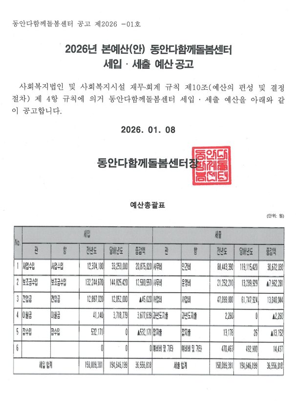 사단법인 다음세대희망나눔 부설 해밀지역아동센터 2026년도 예산안 공고
