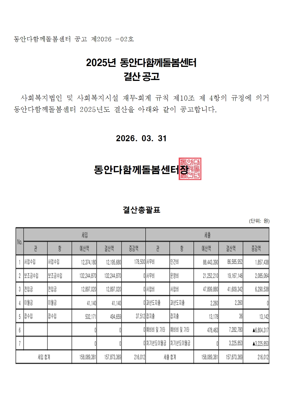 사단법인 다음세대희망나눔 부설 해밀지역아동센터 2025년도 세입세출 결산서 공고